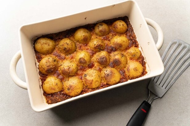 To get a better seasoning on the potatoes, score the potatoes with a crosshatch pattern on the cut side. The easiest way to score the potatoes is on a cloth towel over an even surface. The towel helps keep the potato stable. Use a paring knife to lightly create ¼ inch slices into the potato in two to three parallel lines, turn the potato 90 degrees, and repeat.