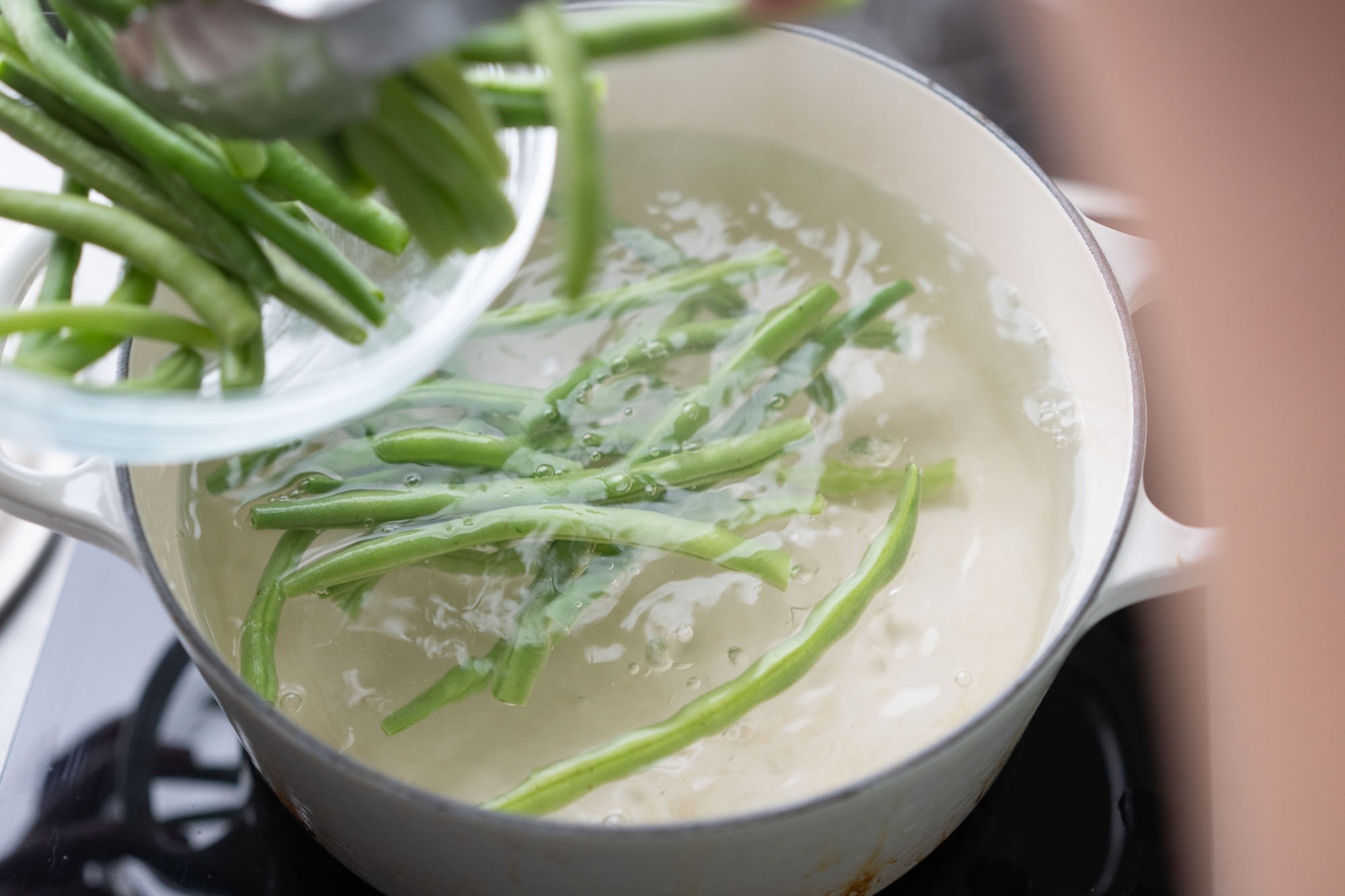 adding green beans to boiling water