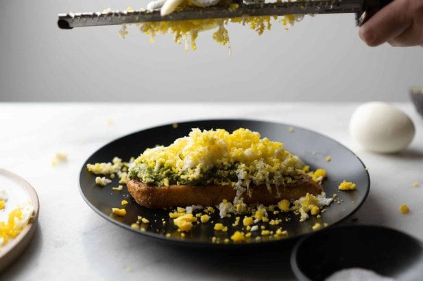 5. Peel your hard boiled egg and wear cut-resistant gloves to grate the egg with a Microplane or very sharp grater over the avo toast. Evenly cover the avocado.