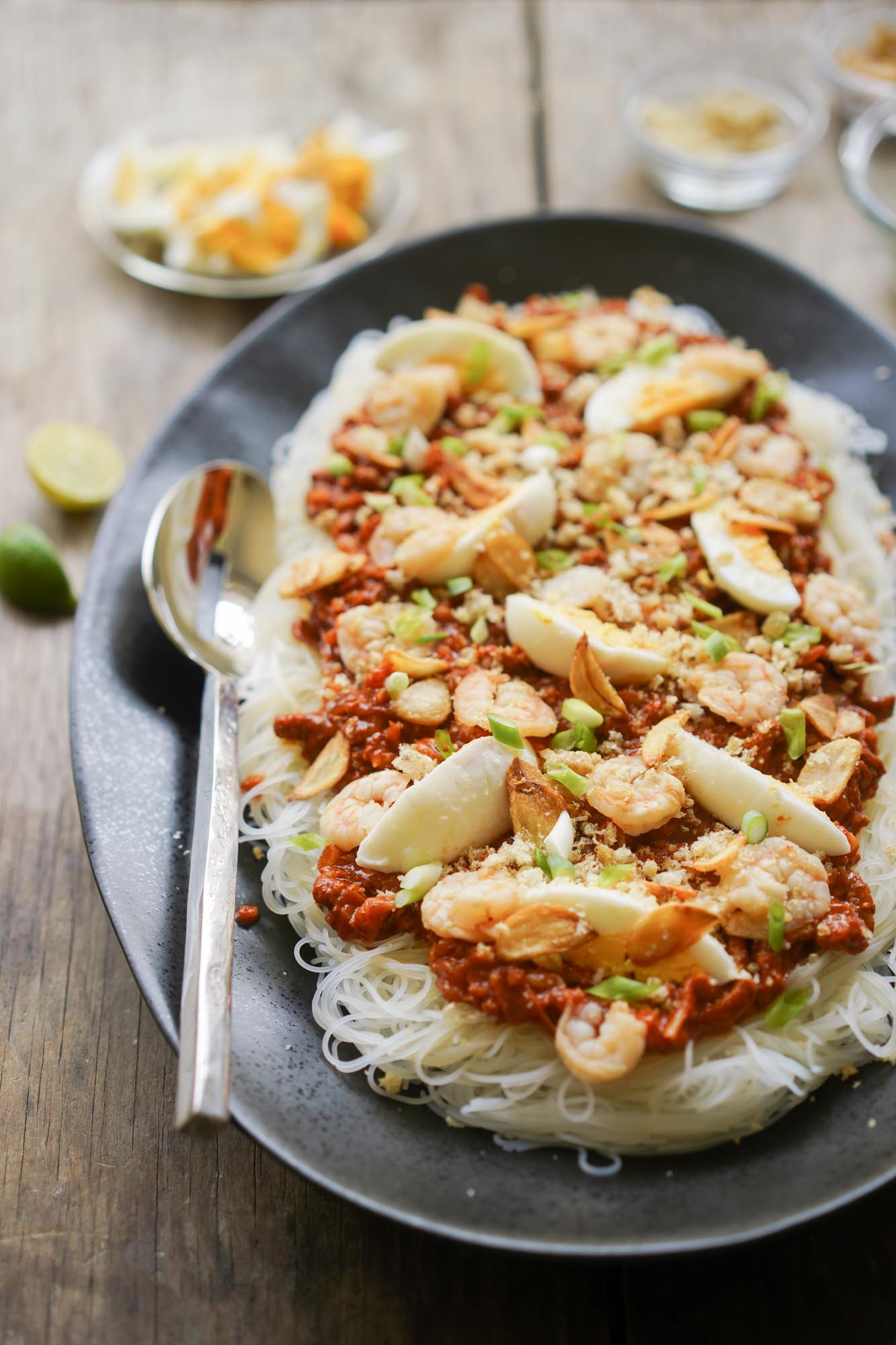 Some traditional toppings include: shrimp, sliced boiled eggs, scallions, crushed chicharon, fried garlic, smoked fish flakes, and more. Because this dish has so many toppings, I would really recommend starting the recipe by prepping the toppings, so that by the time the noodles and sauce are done, you can plop the toppings and eat away!