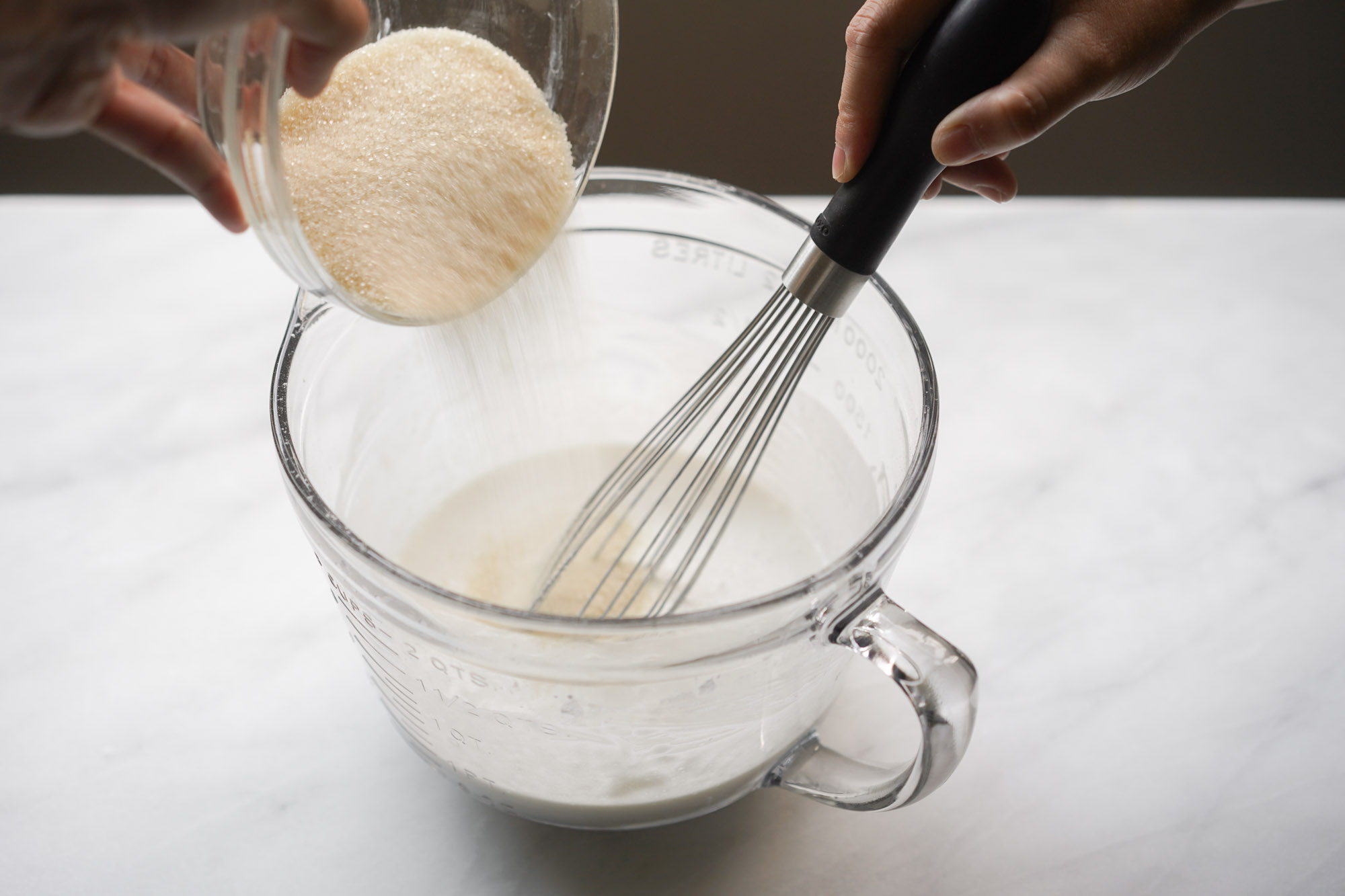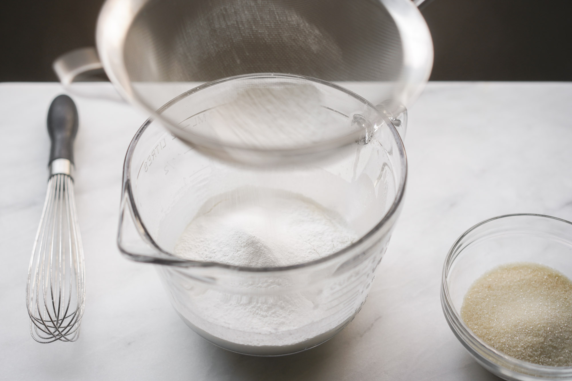• Sift the rice flour and baking powder over the wet ingredients. Use the whisk to mix all the ingredients together.