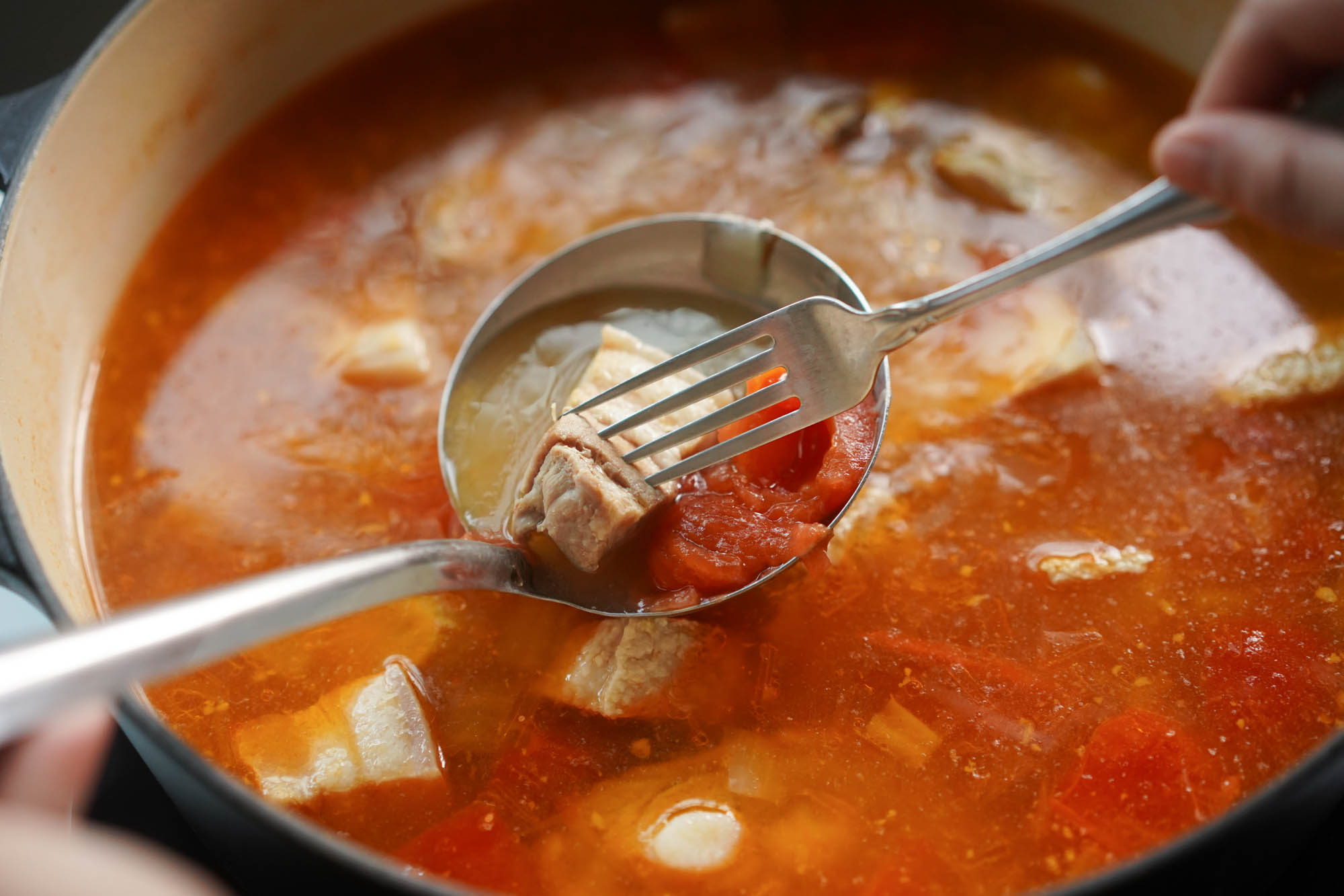 3. Sear and braise the pork with tomatoes. Tomatoes also give this soup it’s sour flavor and acidity. You want to make sure to add most of the tomatoes at the beginning of the braise to squeeze out that acidic flavor into the broth. Many of these tomato pieces are obliterated after braising, so you also want to make sure you save at least one tomato piece to add later on.