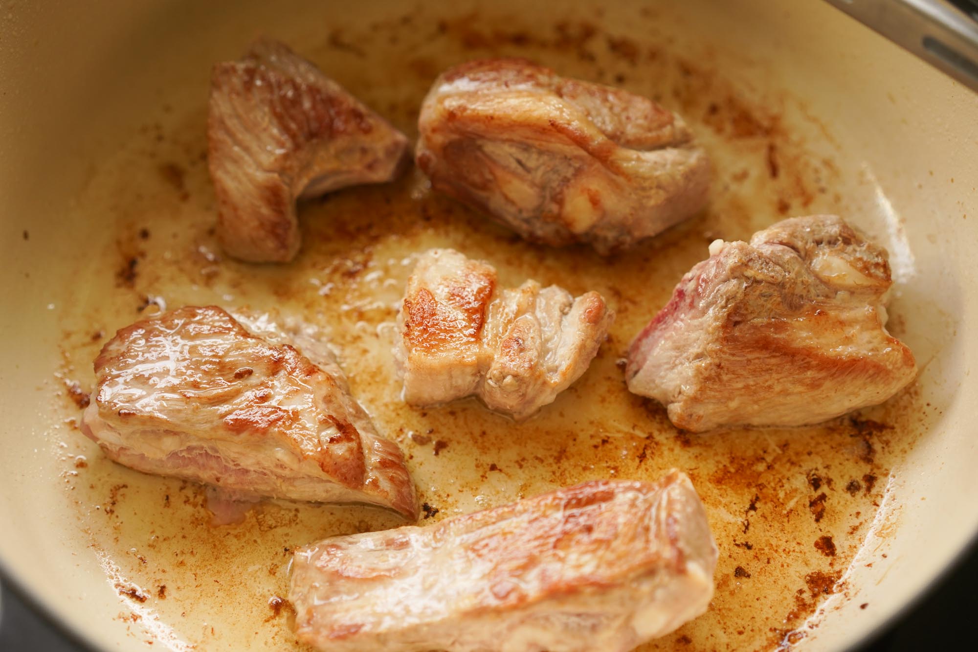searing pork in a pot
